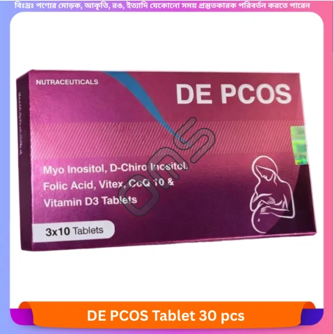 The DE PCOS Tablet is a nutraceutical supplement designed to support hormonal balance and metabolic health in women with Polycystic Ovary Syndrome (PCOS). It contains a blend of inositols, vitamins, and herbal extracts.
